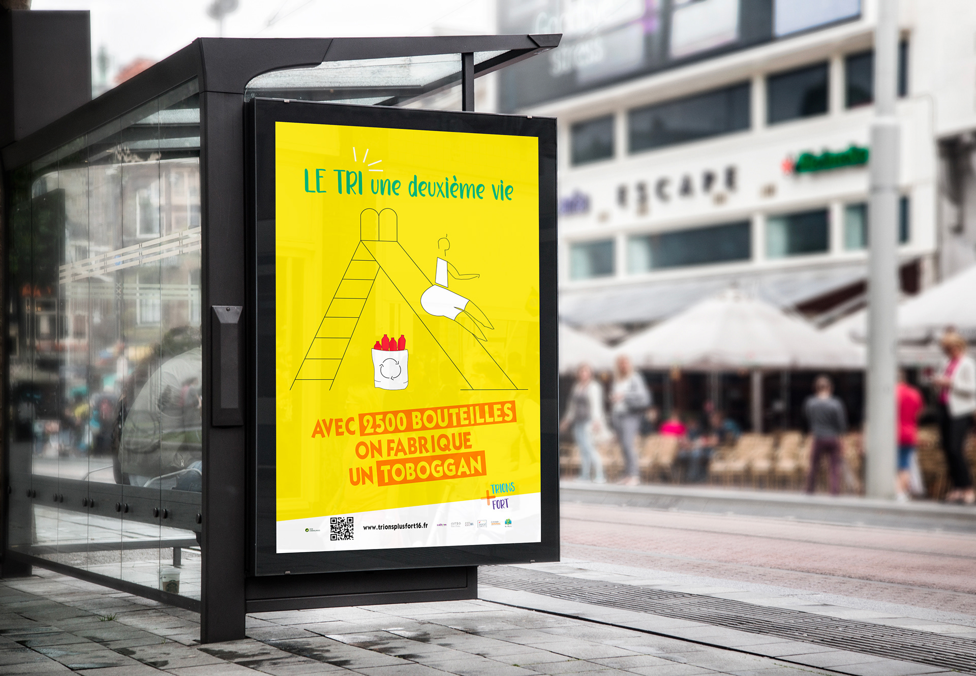 Les consignes étaient de créer des affiches ludiques, colorées, figuratives et explicites. Pour cela, les textes ont été mis en avant avec tout d’abord le titre écrit dans une typologie ronde afin d’adoucir le côté contraignant du tri. Et pour le texte une police plus impactante avec un surlignement des mots clés. Les couleurs sont vives, jaune pour illustrer le recyclage du plastique.